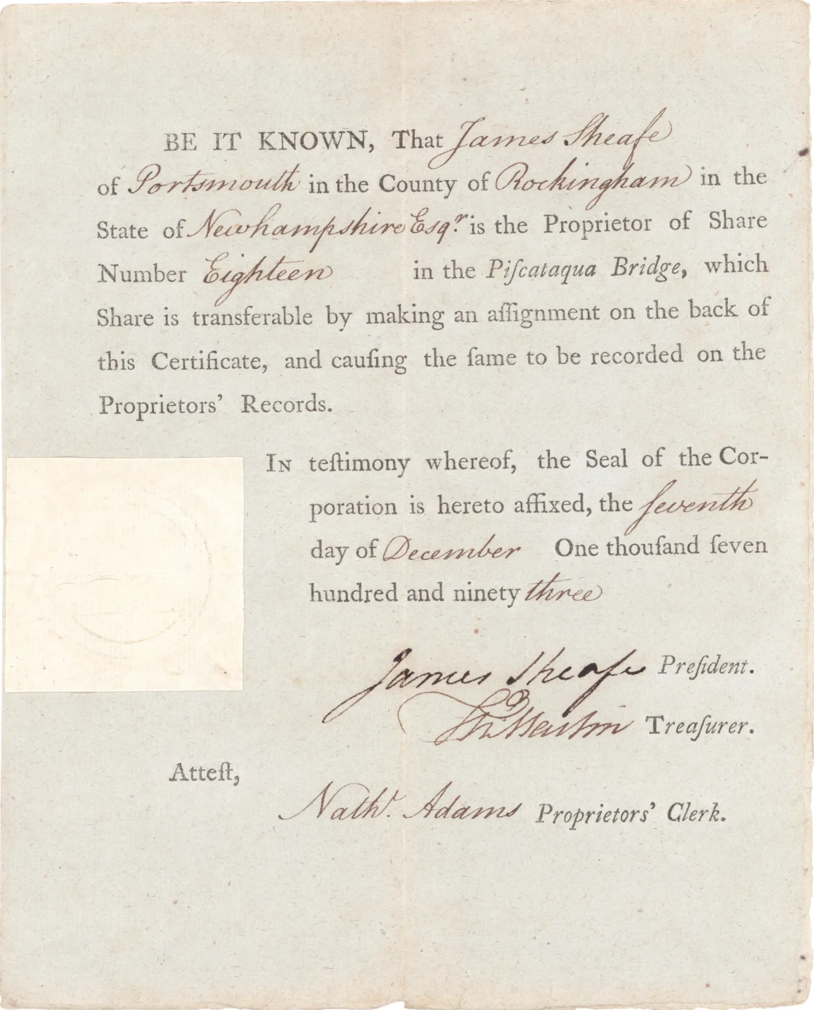 Chartered in 1793. Located six miles west of Portsmouth, New Hampshire, and was built in 1794 with a span of 244 feet connecting with Kittery, Maine. It was the longest span bridge in the United States when it opened, holding that record until Lewis Wernwag built his Colossus Bridge across the Schuylkill River north of Philadelphia in 1812 with a span of 340 feet.