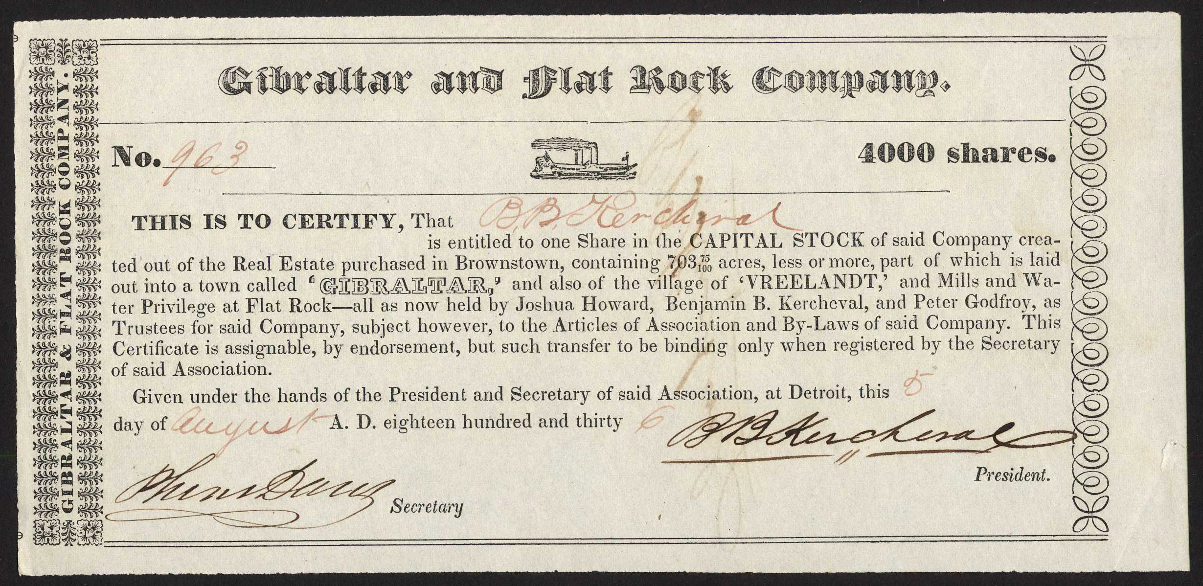 Formed in Detroit to build a canal to connect Lake Erie with Lake Michigan which failed to come to fruition. The company platted and recorded the village of Flat Rock in 1838, originally the two locations of Vreelandt (named after the family that settled there) and Smooth Rock.