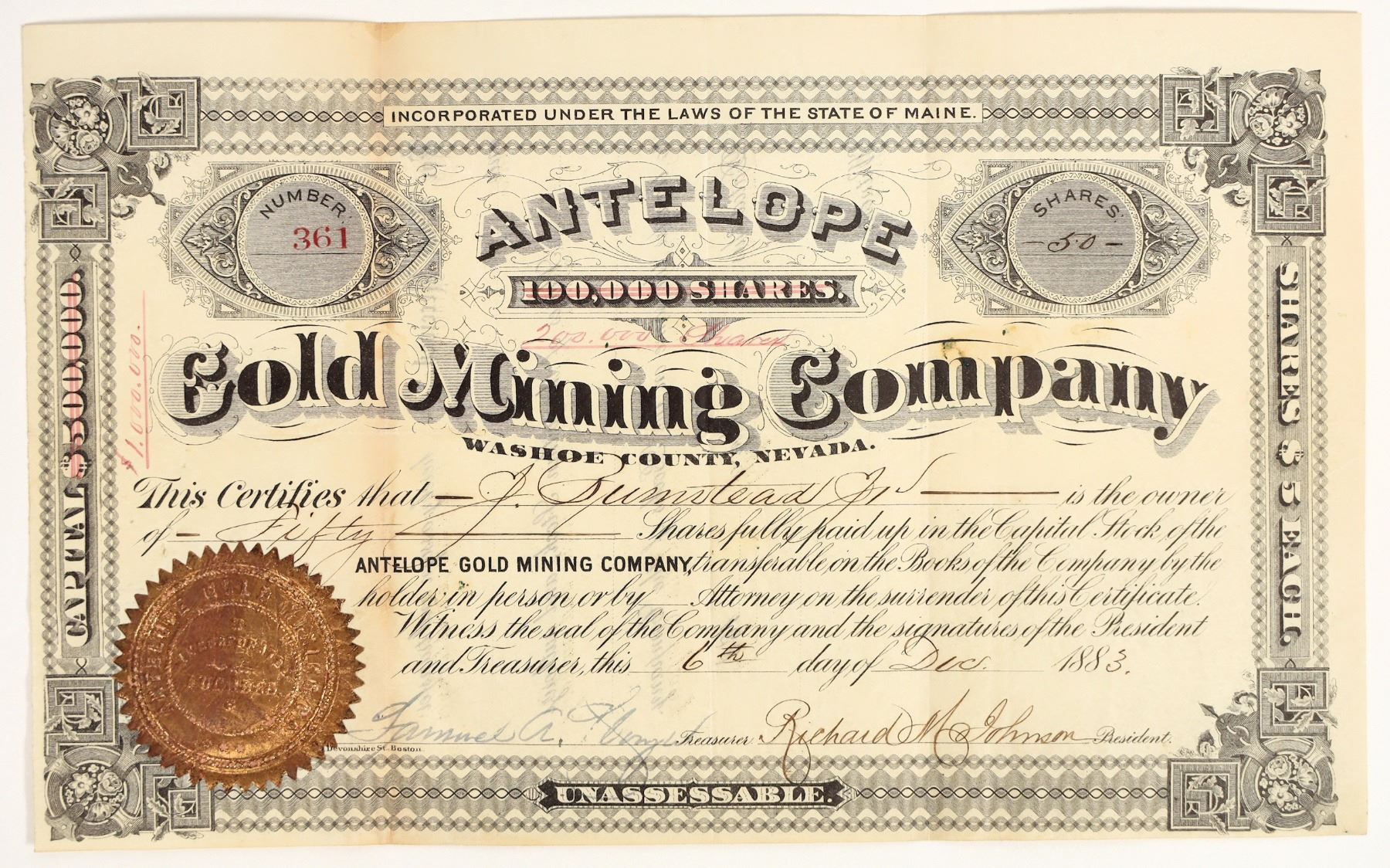 Incorporated in Maine by 1883. Property in Washoe County, Nevada.