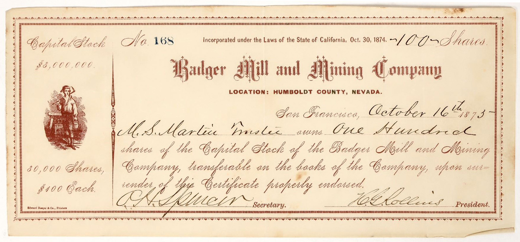 Incorporated in California 30th October 1874. This company operated at the mouth of Bartlett Creek, Columbia District, west of Quinn River Valley, Humboldt County. They owned a 5-stamp mill and the Independent Lode (Silver State, Feb. 3, 1877). (Holabird Americana)