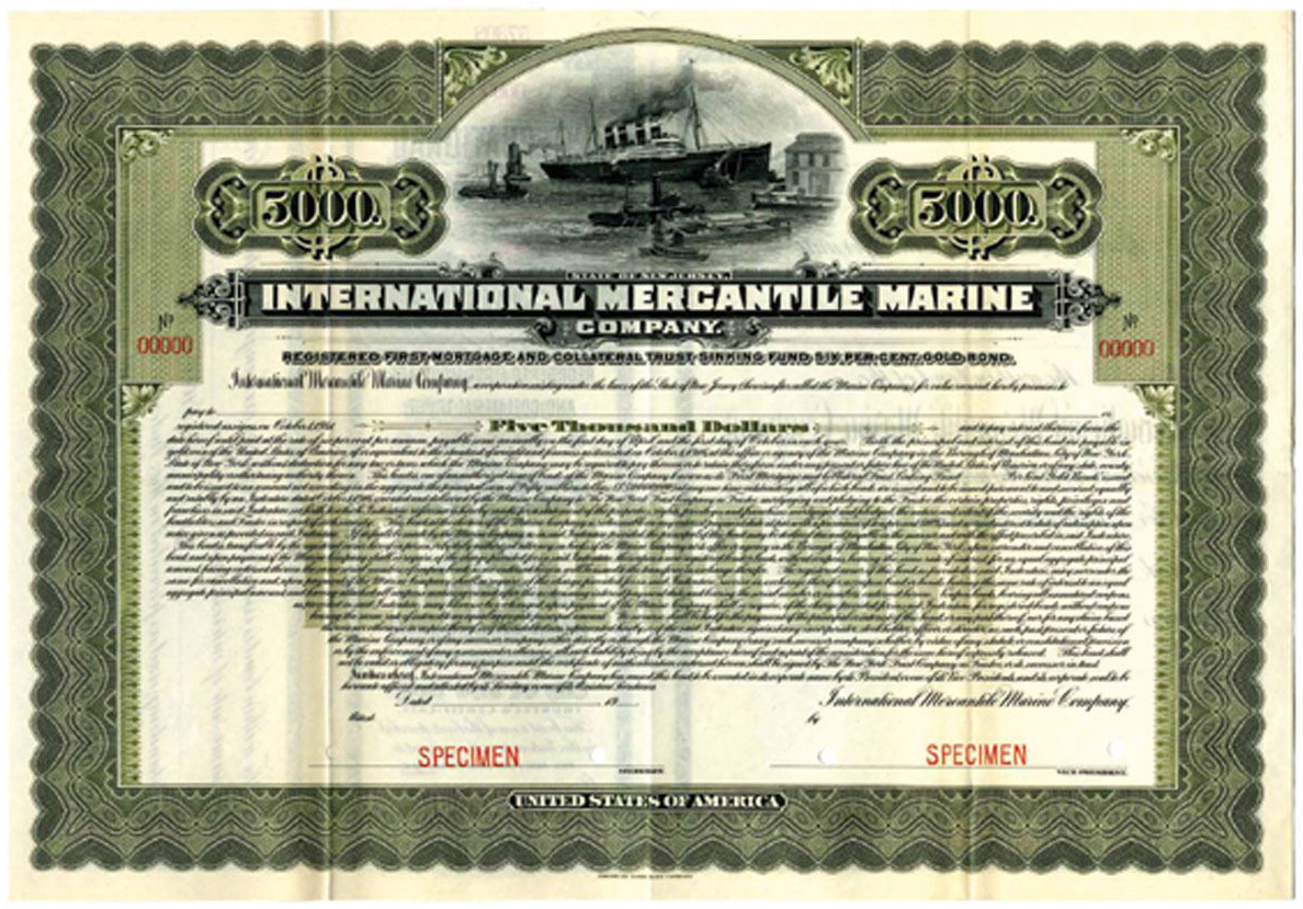 Incorporated in New Jersey 1st October 1902 to bring under one management several shipping companies including the White Star Line. After the sinking of the company’s flagship Titanic in 1912 their fortunes declined and the company went into receivership in 1915 but was saved and continued until the late 1920’s.