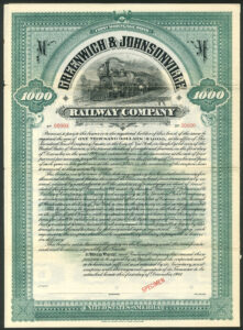 Incorporated as the Union Village and Johnsonville Rail Road Company on 3rd October 1866, to build a line from Union Village (as Greenwich was then known) to Johnsonville. Union Village was renamed Greenwich in 1867 and the title became Greenwich and Johnsonville Rail Road Company. Reorganised as this in 1879.