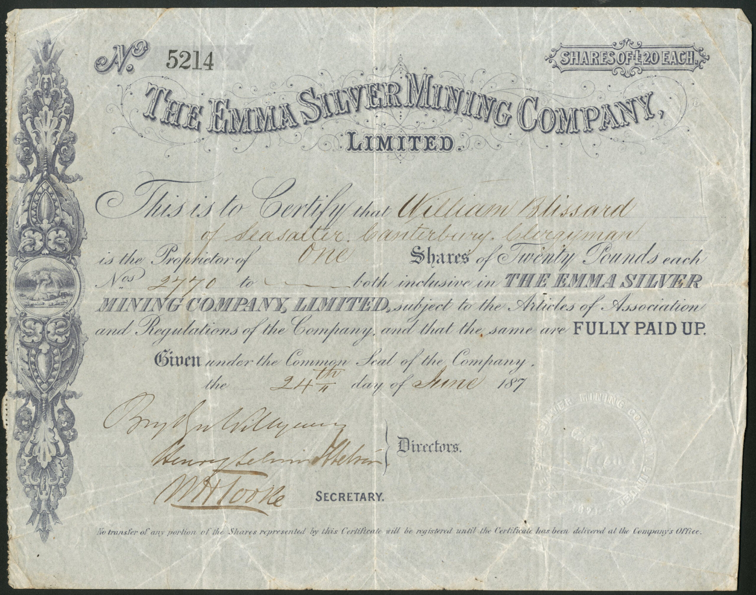 Registered 1871. One of the best known mining scandals involving U.S.Senator Stewart and Ambassador to England, Schenk, who offloaded this Utah property for a huge price to British investors. Baron Grant played a major part in its promotion to the British public. It was reconstructed no less than 5 times between 1872 and 1900 when the British investors finally got out. Dissolved <1916. Company number 5809